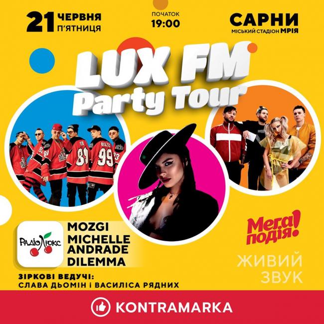 Як давно ви були в Сарнах? Більшість скажуть, що давно або не були взагалі. Тож для цієї більшості є гарна новина – у вас є привід відвідати це чудове місто 21 червня! В Сарни у рамках LUX FM Party Tour веземо шалений гурт “Мозгі”, чаруюча Мішель Андраде та драйвовий гурт “Дилемма”! За гарний настрій відповідають ведучі “Люкс ФМ” Слава Дьомін та Василіса Рядних.