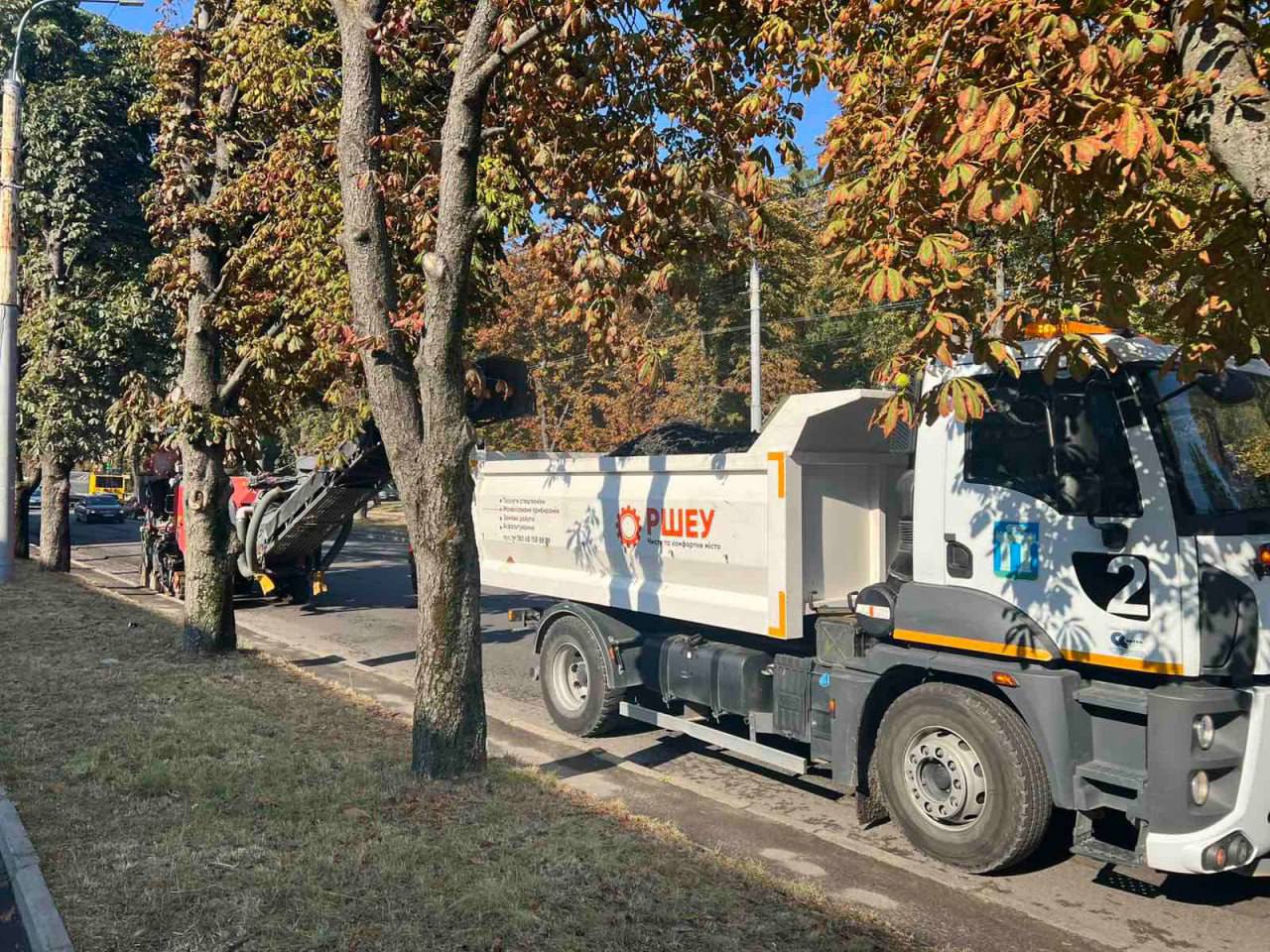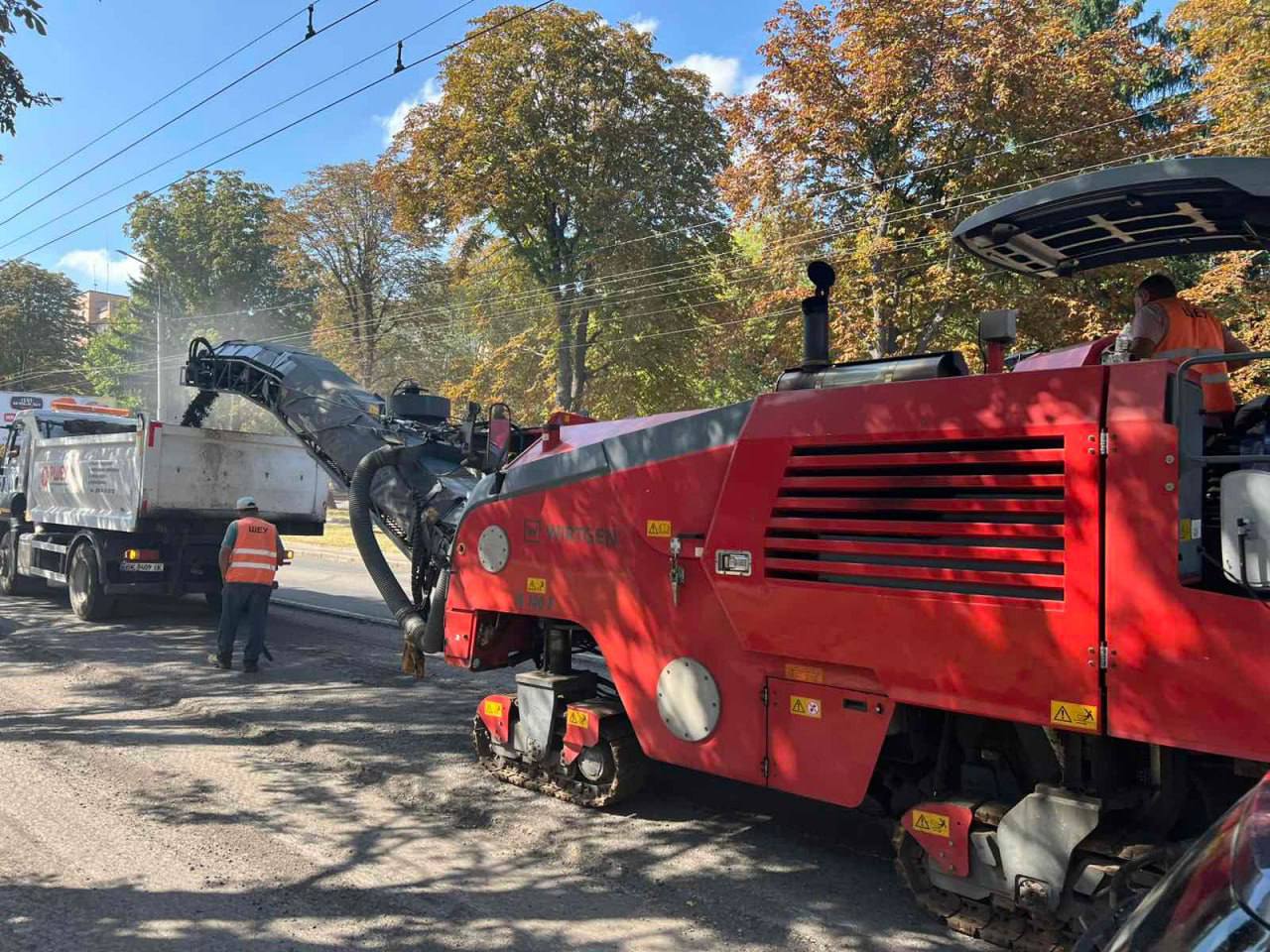 Щоб усунути аварійну ямковість на вулиці Василя Червонія, працівники міського ШЕУ спочатку за допомогою спецтехніки видалили пошкоджений шар дорожнього покриття, щоб усунути тріщини та вибоїни.