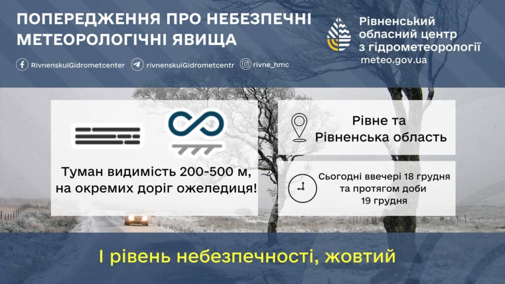Сьогодні ввечері 18 грудня та протягом доби 19 грудня по місту Рівне та Рівненській області очікується туман 200-500м, на окремих ділянках доріг ожеледиця!1-й рівень небезпечності – жовтий, – повідомили в обласному центрі з гідрометеорології