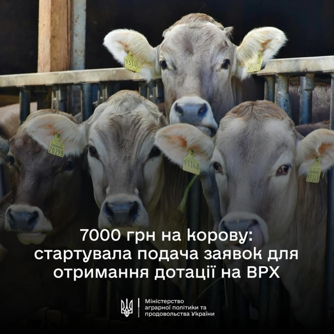 Заявки на отримання дотації приймають через Державний аграрний реєстр (ДАР). Її надаватимуть для тих, хто має у власності від 3 до 100 корів усіх напрямів продуктивності. Розмір дотації становить 7 тис. грн за кожну тварину.