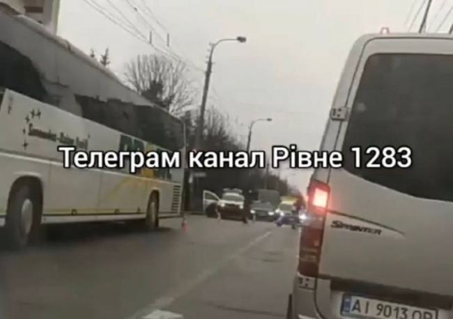 Відео з місця події опублікували в телеграм-каналі «Рівне 1283». За словами очевидців, на дорозі — пошкоджене службове авто поліцейських і міжнародний автобус «Щецин-Суми».