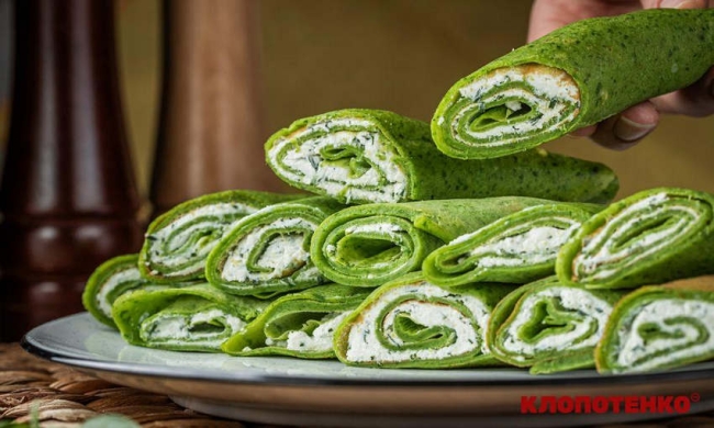 Перебийте у блендері 150 г шпинату, додавши трохи води для легшого збиття. В мисці змішайте 2 яйця, 175 мл молока, 150 г борошна, ½ ч. л. солі, 1 ч. л. цукру. Добре перемішайте, щоб не було грудочок, та додайте ще 175 мл молока, шпинатну суміш та 3 ст. л. олії. Дайте тісту постояти 15 хвилин. Добре розігрійте пательню та посмажте млинці з усього тіста.
