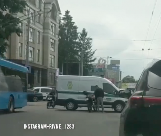 Як видно з відео, яке опублікували в групі «rivne_1283», мотоцикліст зіткнувся з інкасаторським автомобілем «Ощадбанку».