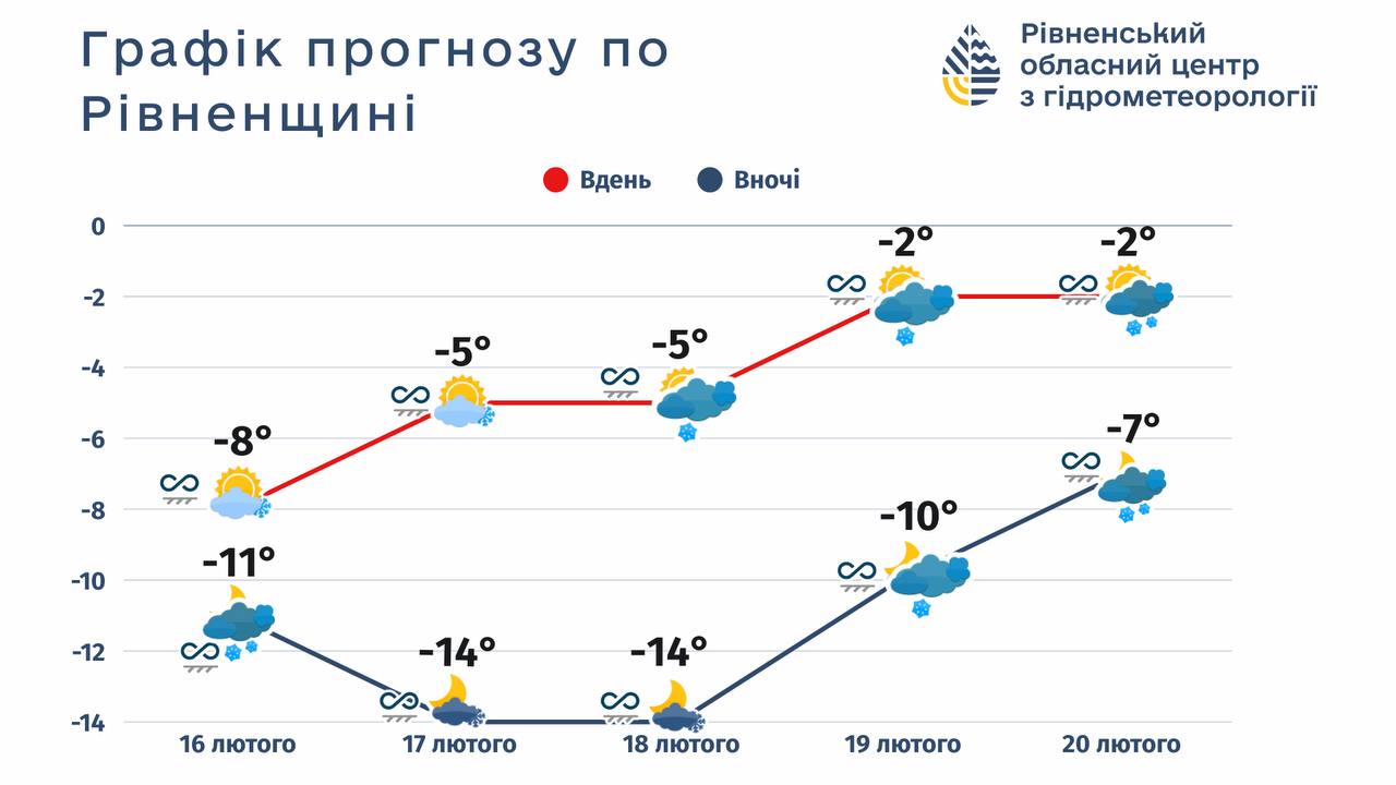 18 лютого, середа: хмарно з проясненнями. Вночі без істотних опадів, вдень невеликий сніг та мокрий сніг. На дорогах ожеледиця. Вітер північно-західний, 7-12 м/с. Температура вночі 12-17° морозу, вдень 2-7° морозу. Атмосферний тиск буде падати.