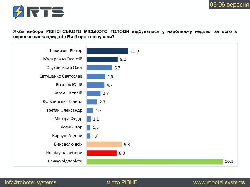 Соціологічна компанія “RTS” (“Роботизовані телесистеми”) провела дослідження громадської думки з 5 по 6 вересня методом телефонних інтерв’ю, на основі бази верифікованих мобільних телефонних номерів.