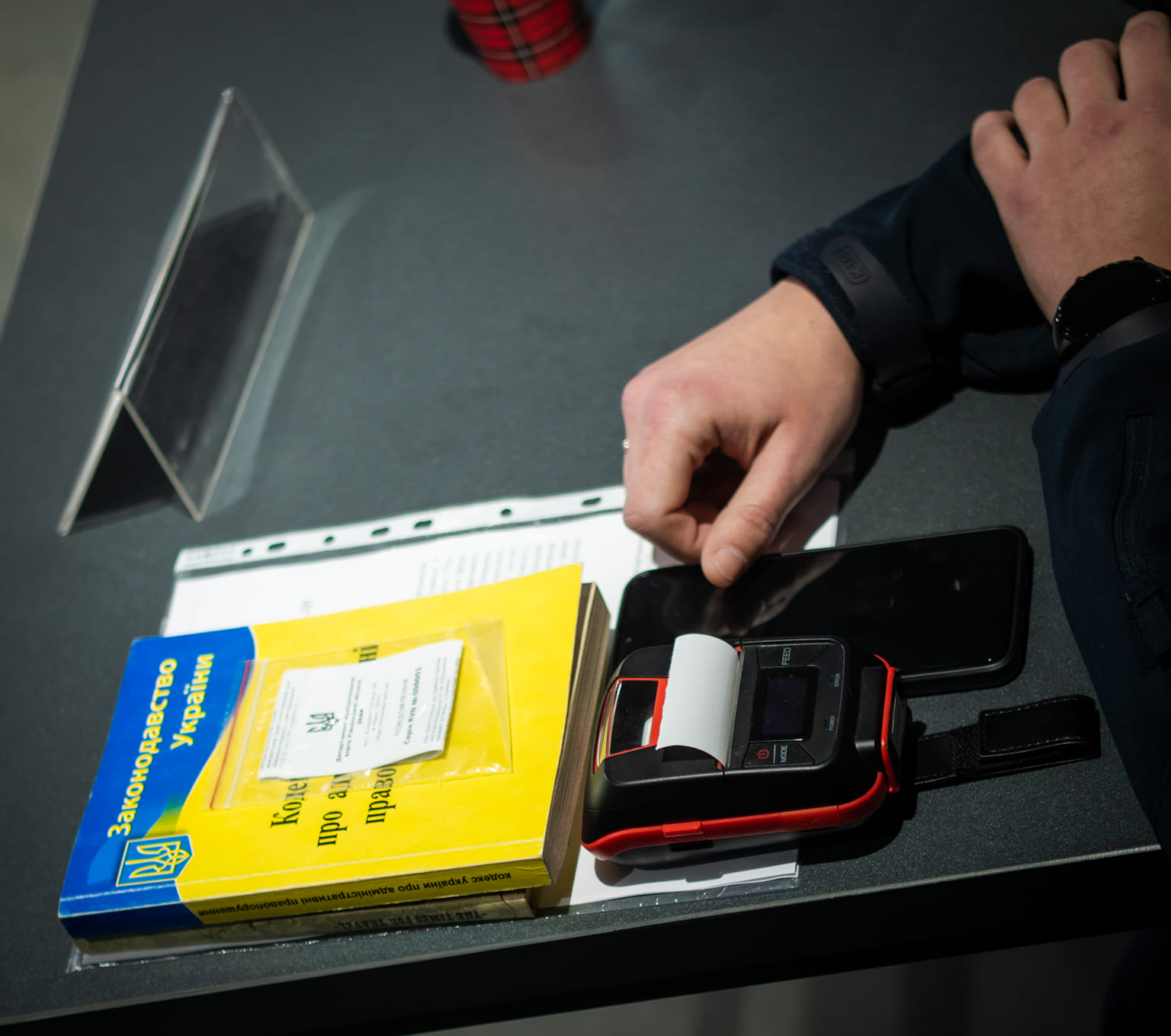 — Інспектор за допомогою світломіра здійснює замір від кромки тротуару до автомобіля. При створенні повідомлення про притягнення до адміністративної відповідальності інспектор вказує наступні дані: марку автомобіля, частину статті КУАП, яку порушив водій, і відповідний пункт ПДР. На підставі цього розмір штрафу буде коливатися від 340 до 680 гривень. Після повторної фотофіксації можна друкувати саме паперове повідомлення. Залежно від погоди, його можна покласти у зіп-пакет. Інспектор залишає його на лобовому склі й робить ще одну фотографію автомобіля з повідомленням на склі. Дані передаються, встановлюється особа і формується постанова.
