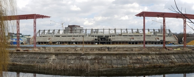 Також тривають роботи з облаштування східної трибуни, яка зі сторони Усті. З одної частини уже зроблено кладку основних несучих стін, виконується облаштування монолітних балок та поясів, яке дозволить в подальшому робити перекриття.