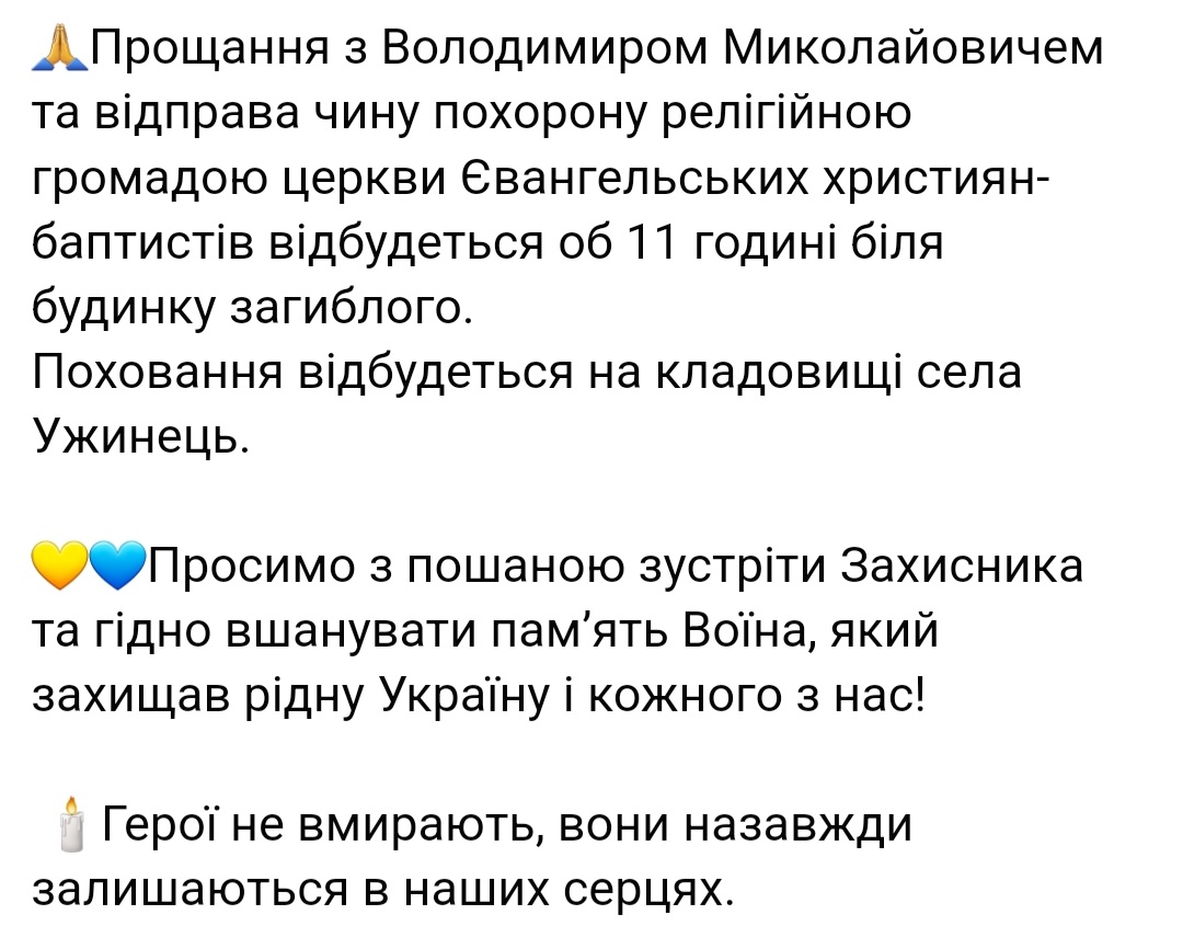 Завтра захисник назавжди повернеться додому. У Млинівській селищній раді просять мешканців громади гідно зустріти свого героїчного земляка.