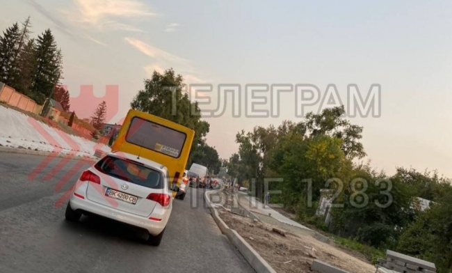 Увечері рух дорогою перетворився на справжню “тягнучку”, в якій стоять і легкові автомобілі, і маршрутки. Фото затору оприлюднили на телеграм-каналі Рівне1283.