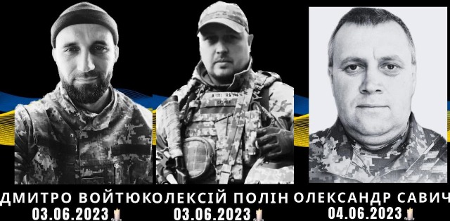 – На жаль, маємо ще три втрати. Мешканець міста Сарни Дмитро Войтюк, 1993 року народження, захищав нашу державу від окупантів. Молодший лейтенант загинув 3 червня під час виконання бойового завдання. Мешканець міста Сарни – молодший сержант Олексій Полін, 1991 року народження, загинув 3 червня. Сарненець – молодший сержант Олександр Савич, 1976 року народження, також загинув під час виконання бойового завдання поблизу населеного пункту Дачне Донецької області. Щирі співчуття рідним та близьким. Вічна памʼять, честь та шана Героям, – написав на своїй фейбук-сторінці міський голова міста Сарни.