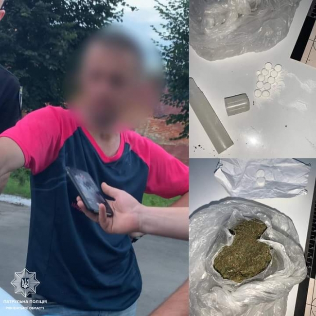 Під час поверхневої перевірки патрульні виявили пакет з таким вмістом: подрібнена речовина бурого кольору рослинного походження, зовні схожа на наркотичну, та 10 таблеток невідомого походження, 4 таблетки у блістері та 2 — у паперовому.