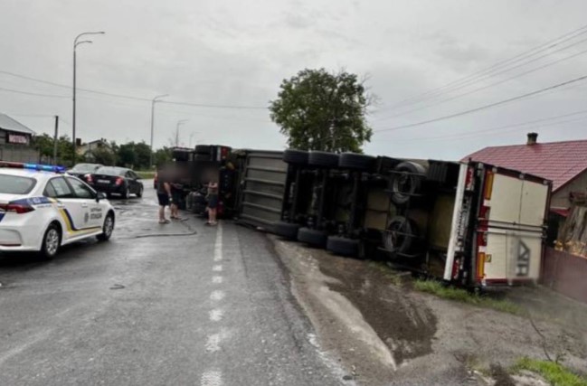 Водій вантажівки «Mercedes-Benz» на заокругленій ділянці дороги не впорався з керуванням, тому машина перекинулася.
