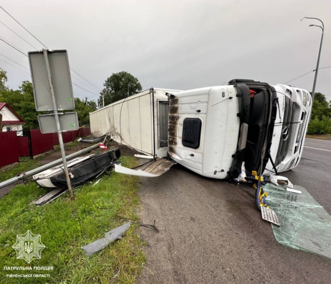 Водій вантажівки «Mercedes-Benz» на заокругленій ділянці дороги не впорався з керуванням, тому машина перекинулася.