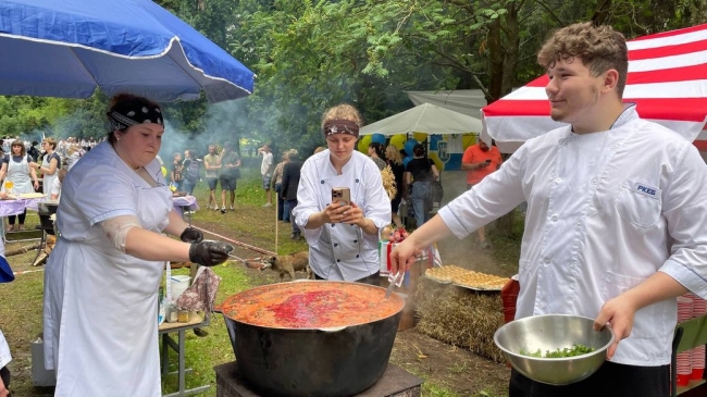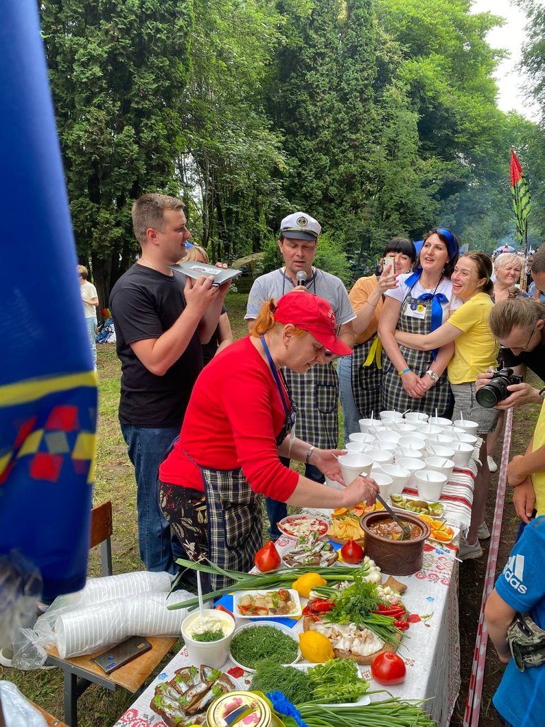 – Захід об’єднав місцеві родини та переселенців задля спільного результату — найсмачнішого українського борщу. Під девізом “Молодий борщ єднає Україну” смакуємо 13 регіональних борщів, які приготували команди з Маріуполя, Харкова, Херсонської, Луганської, Запорізької, Житомирської, Хмельницької, Тернопільської, Рівненської областей. Зірковий борщ готуватиме гість заходу Костянтин Грубич.