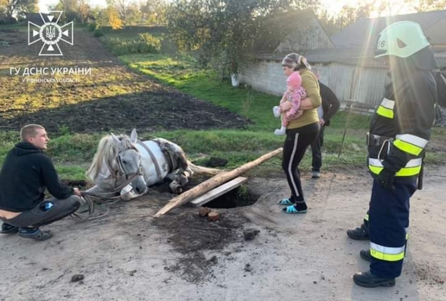 У селі Курозвани Гощанської ткриторіальної громади провалився в колектор водостічного колодязя кінь. Самотужки люди тварину підняти не змогли.