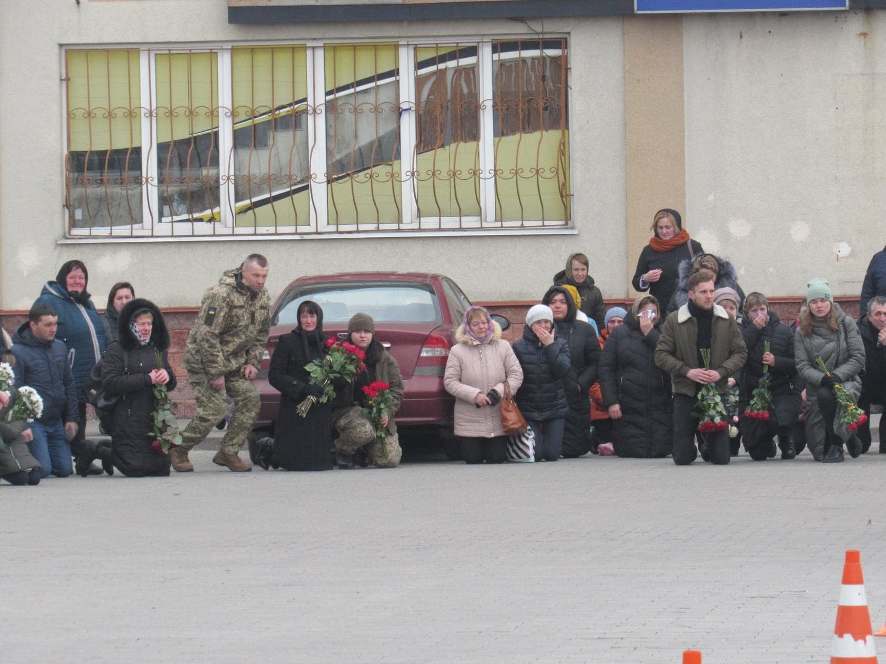 Із загиблим воїном жителі Корецької громади прощалися стоячи на колінах та не стримуючи сліз.