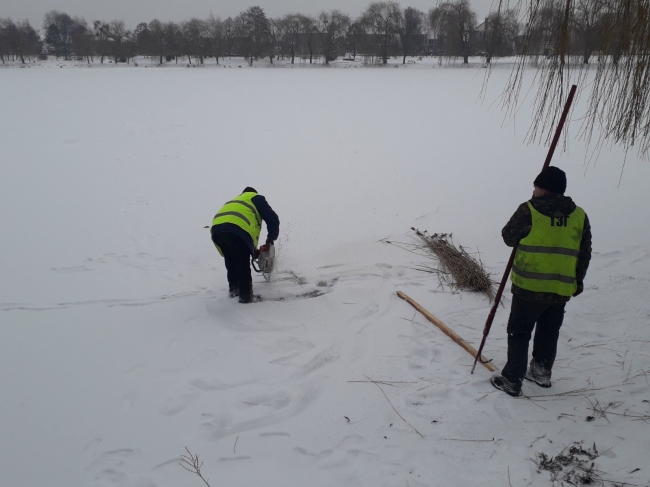 Сьогодні на озері “Лебединка” працівники тресту зеленого господарства робили так звані продухи у кризі, щоб уникнути мору риби у водоймі.
