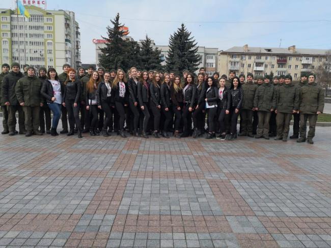 Військовослужбовці на майдані Незалежності вишикувалися у три взводи. Під барабанний бій кожен зі взводів стройовим кроком прийняв форми букв «НГУ» (абревіатура Національної гвардії України). Після чого взводи вишикувалися у формі цифри «5», а опісля разом зі студентками НУВГП – у герб України, повідомляє прес-служба рівненської частини Нацгвардії.