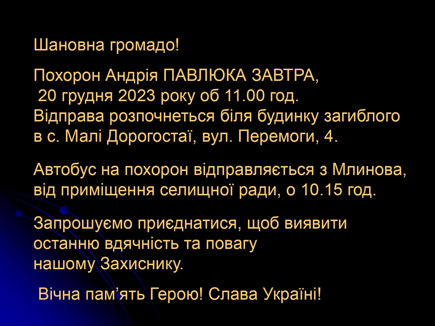 Офіцера поліції поховають на Млинівщині 20 грудня. Цей день у громаді оголосили Днем жалоби. Андрія Павлюка поовають у рідному селі Малі Дорогостаї, повідомляє Млинівська селищна рада.