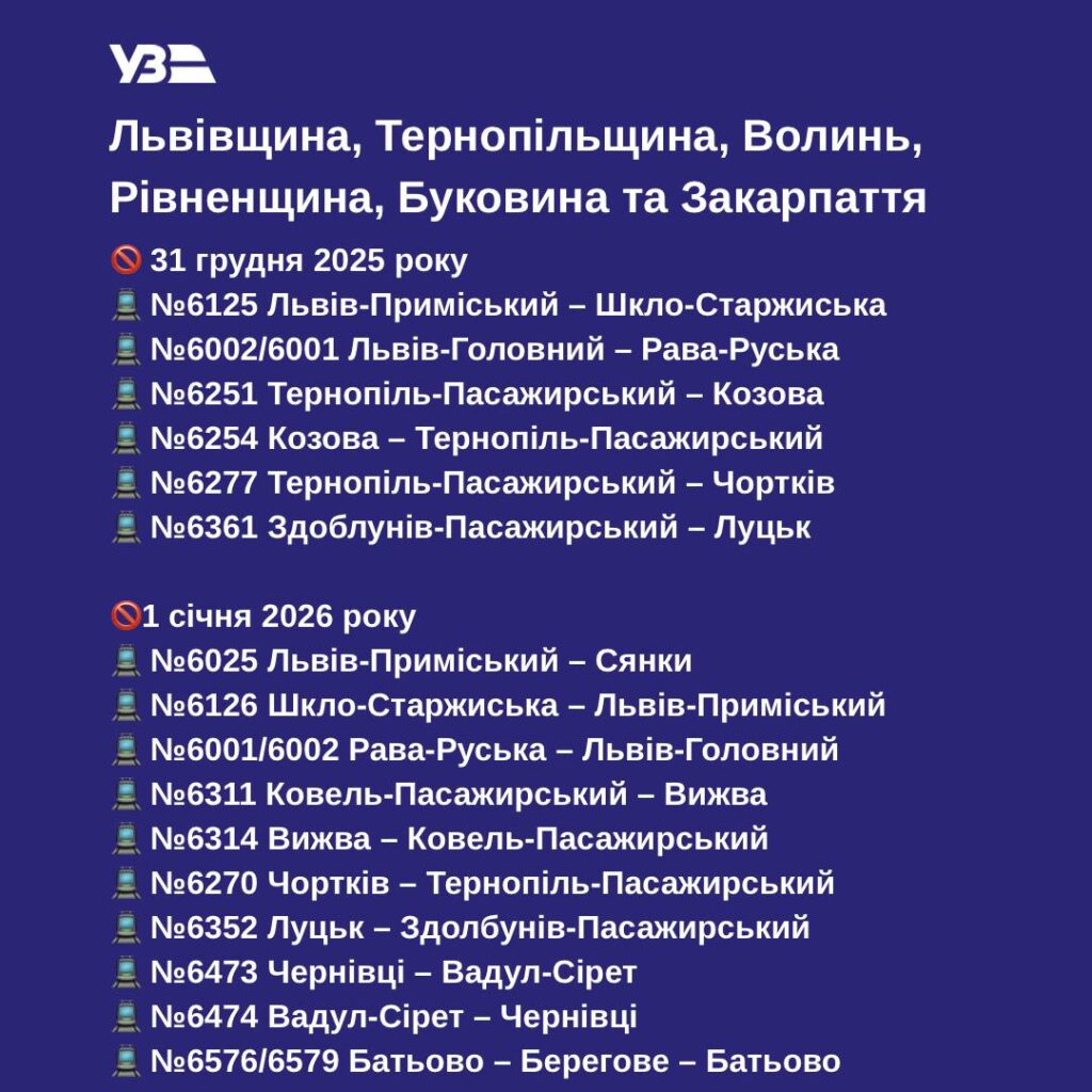 – 31 грудня 2025 року потяг № 6361 Здолбунів–Пасажирський — Луцьк;