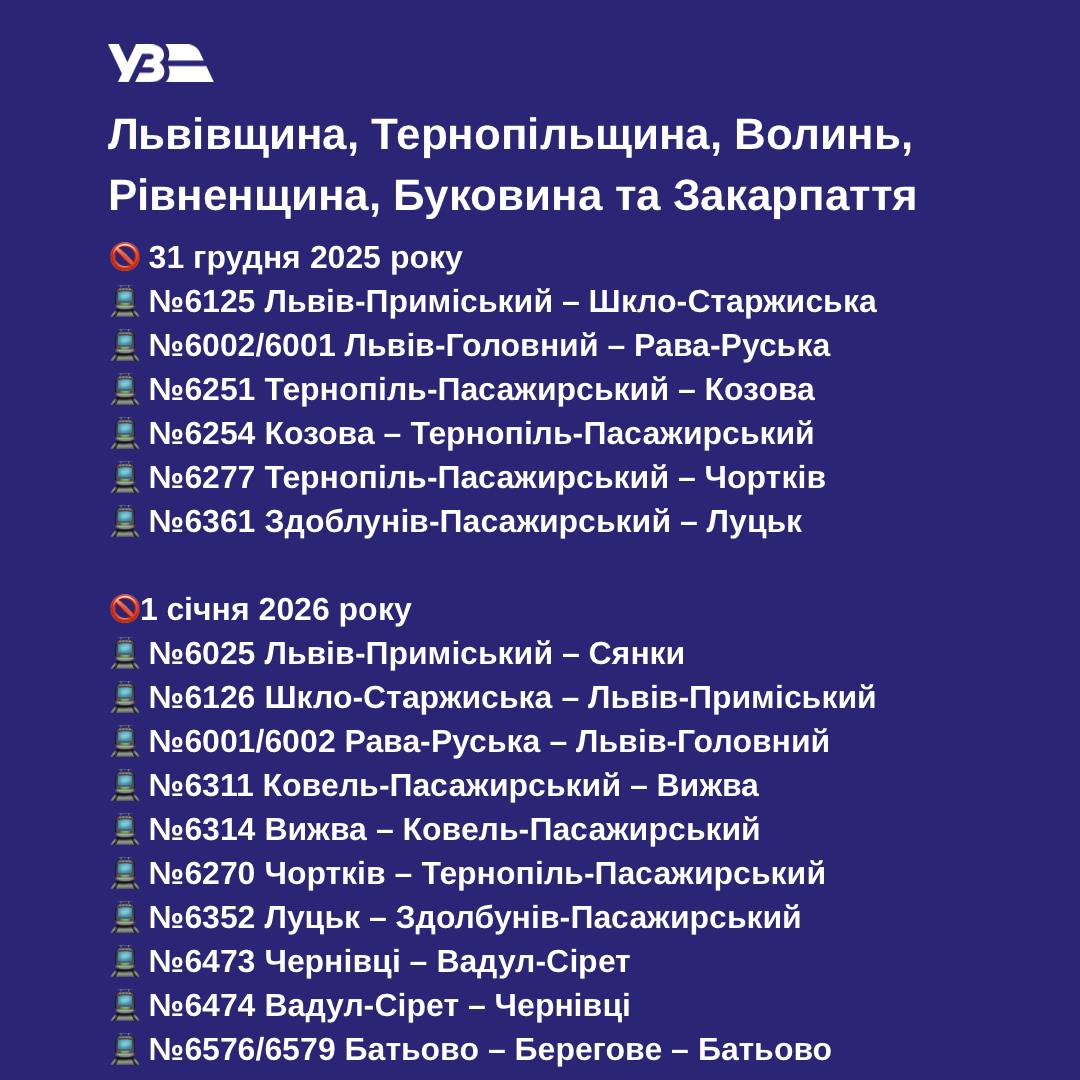 – 31 грудня 2025 року потяг № 6361 Здолбунів–Пасажирський — Луцьк;