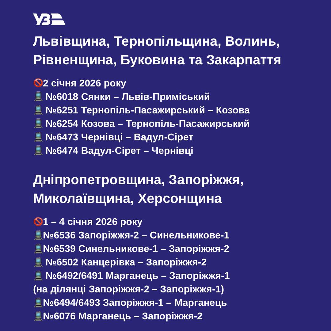 – Новорічні свята — це час затишку і трохи іншого ритму життя. У ці дні пасажирів на окремих приміських напрямках меншає. Тож у ці дні деякі приміські та регіональні поїзди тимчасово не курсуватимуть, детальніше на зображеннях, – пояснили залізничники.