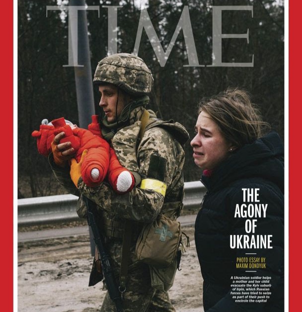 Так, на обкладинці журналу – український військовий, який тримає на руках немовля, а поряд із ним йде жінка у сльозах.