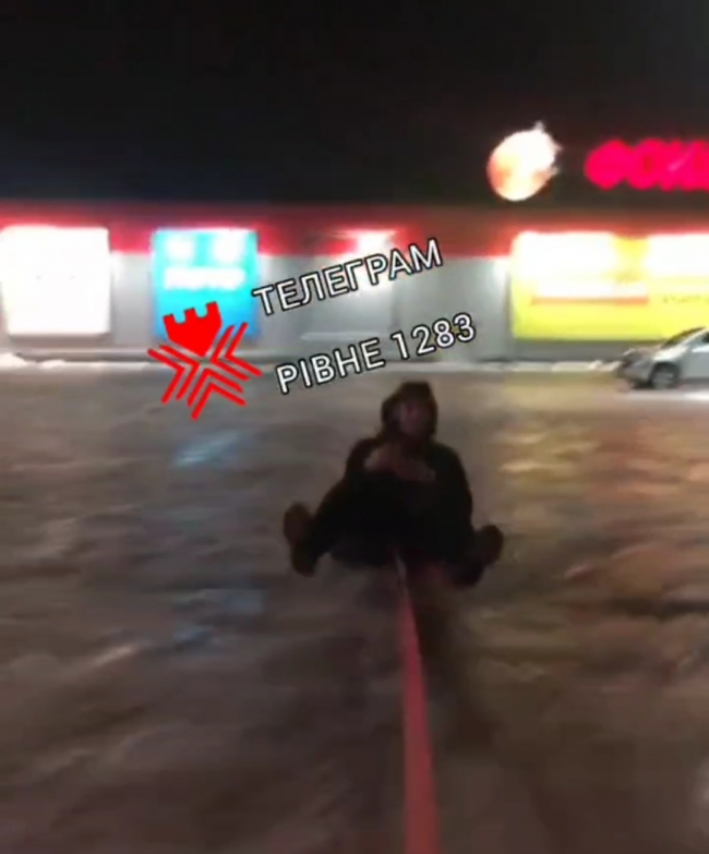 Відео небезпечної розваги, де молодика тягнуть на червоному тросі по слизькій парковці, виклали у телеграм-каналі Рівне1283.