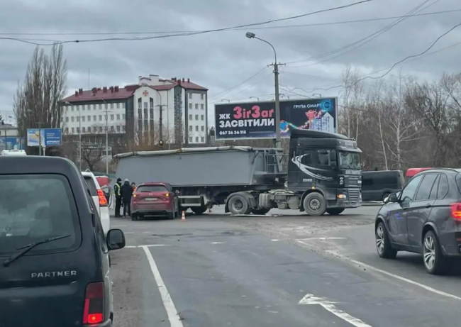 З нього видно, що внаслідок зіткнення механічні ушкодження отримав легковик, який в’їхав у вантажівку. На місці події працюють поліцейські. Вони з’ясовують обставини ДТП.