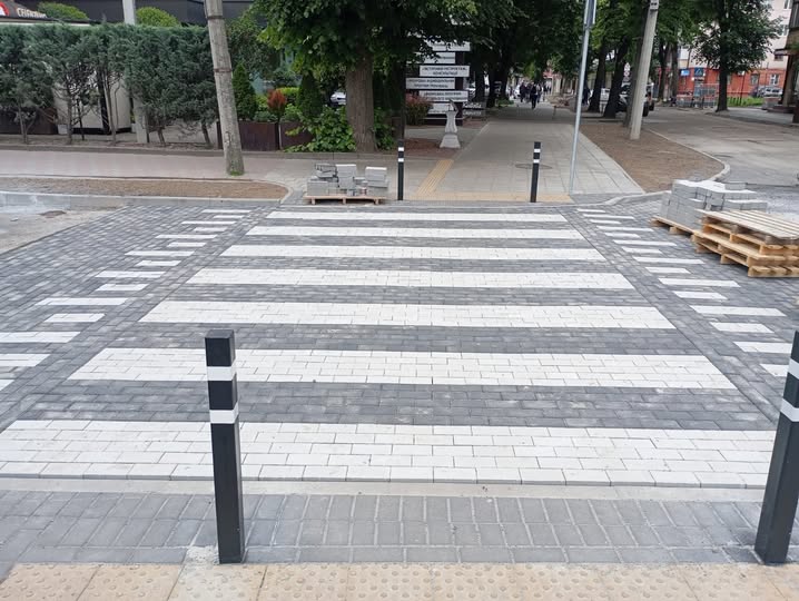 Та особливо привертає увагу пішохідний перехід на розі вул. Симона Петлюри та Словацького: замість звичної фарби чи пластику розмітка виконана білою бруківкою, для чого залучали запрошених фахівців. Перевага у тому, що така «зебра» не зітреться з часом від тертя автомобільних шин чи погодних умов, що означає довговічність покриття та більшу безпеку для пішоходів. Окрім того, водії інстинктивно змушені зменшувати швидкість, бо відчувають нерівність під колесами. А щоб автомобілі не заїжджали на тротуар, шлях їм перегороджують спеціальні обмежувальні стовпчики. Та й сам перехід з тротуару на проїжджу частину працівники ШЕУ зробили дуже плавним, щоб зручно було проїхати як батькам з дитячим візочком, так і тим людям, хто пересувається на кріслі колісному.