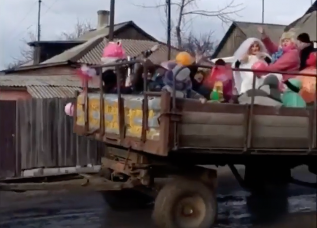 На ньому видно, як «наречена» і гості їдуть вулицею на тракторі, однак усі вони у нетипових костюмах.