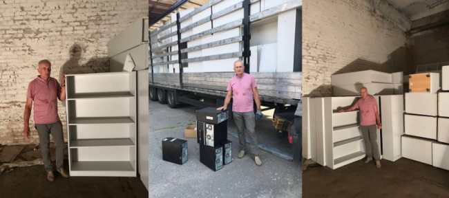 – Ось, нещодавно ми доставили з Німеччини три гуманітарні вантажі 9000 кг., 7581 кг. і 10000 кг., а це – 40 комп’ютерів, шкільні та лікарняні меблі (столи, стільці, полиці та тумбочки, – розповів волонтер Валерій Клюйко.