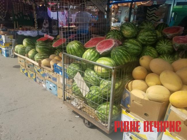 Одразу кидається в очі, що дині, персики та виноград є найбільш затребуваним товаром на ринку.