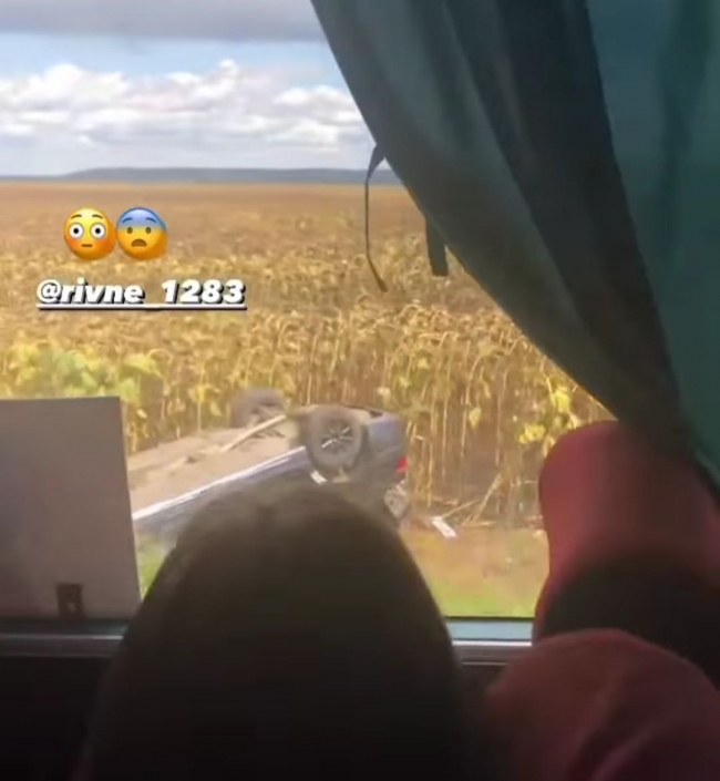 Очевидці опублікували відео в Instagram-спільноті “rivne_1283“, де з маршрутки «Рівне-Острог» видно автомобіль, що злетів у кювет, у соняшникове поле.