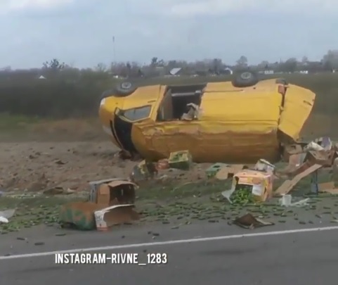 Як повідомляють у групі «Rivne_1283», мікроавтобус вилетів у кювет та перекинувся. Ящики з огірками розкидані по дорозі.