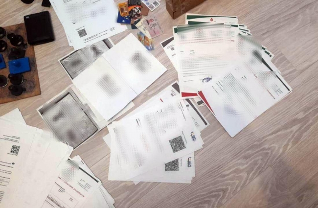 Оперативники виявили та вилучили 94 підроблені міжнародні свідоцтва про вакцинацію від COVID-19, які підлягали збуту, бланки негативних ПЛР-тестів, чорнову бухгалтерію, мокрі печатки медзакладів та лікарів, поліграфічне обладнання.