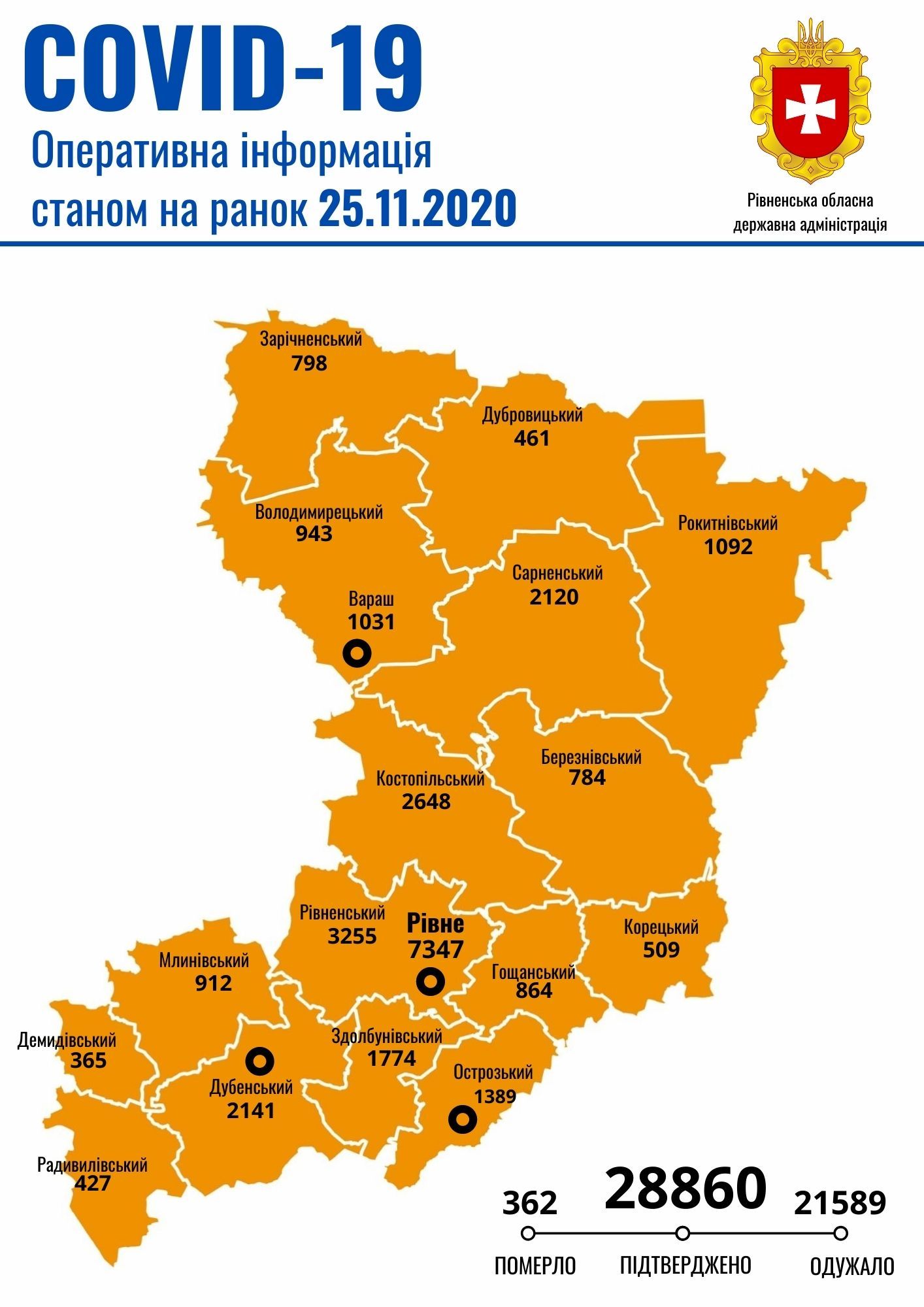 В області зареєстровано 362 летальних випадки, спричинені COVID-19. Померли 52-річна рівнянка та 79-річний житель с. Чудель Сарненського району.