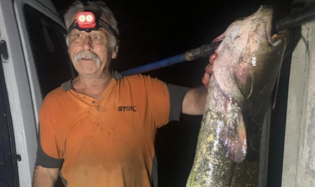 Рибалка, який тримає сом, вирішив показати довжину риби. Чоловік уточнює, що має ріст 1 метр 80 сантиметрів.