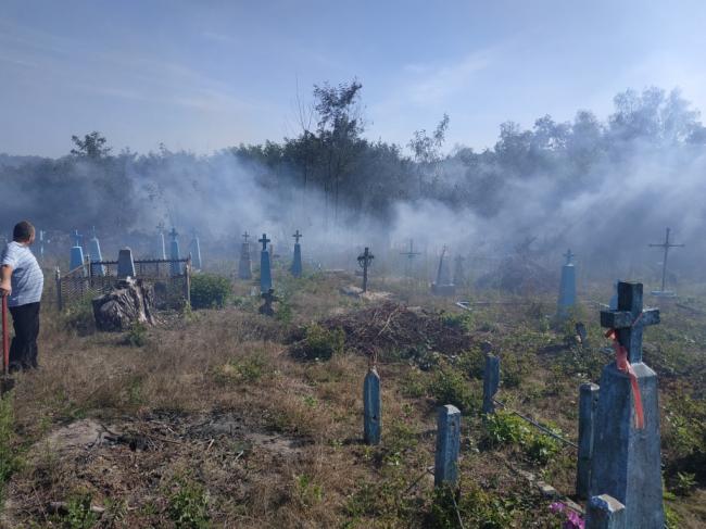 Прибувши на місце виклику вогнеборці встановили, що горить територія кладовища, вогонь розповсюдився на прилеглу територію, де знаходилися колишні силосні ями заповнені побутовим сміттям. На ліквідацію було подано вогнегасні речовини. Площа пожежі становила 90 м.кв.