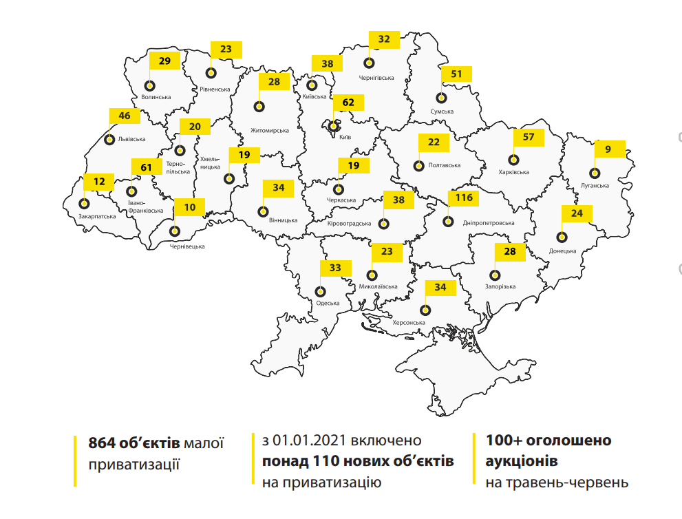 Загалом в Україні уже на травень-червень заплановано більше 100 аукціонів у рамках великої та малої приватизації. Як зазначає заступник голови Офісу президента Кирило Тимошенко, приватизація відтепер є окремою темою селекторних нарад в Офісі президента. Чергова нарада відбулася у понеділок, 17 травня, за участю Фонду держмайна України та обласних державних адміністрацій.