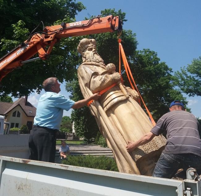 Як повідомляє прес-служба Дубенської міської ради, скульптуру доправили на реставрацію до автора Миколи Бондарчука, оскільки вона почала руйнуватися.