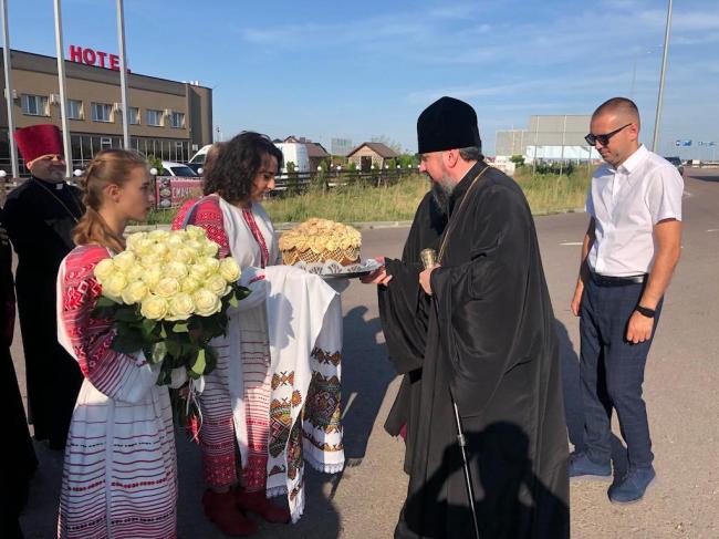 Владика Іларіон привітав митрополита Епіфанія на Рівненській землі, а вихованці Недільної школи Свято-Воскресенського собору піднесли коровай і квіти.