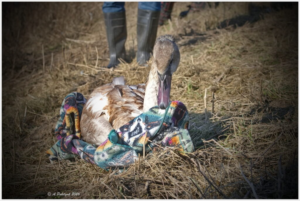 Як розповіла рівнянка Ольга Підгорецька, під час прогулянки повз водойму вона помітила дивний сірий згорток серед лебедів на кризі. Підійшовши ближче, жінка побачила, що птах знесилений, намагається рухатись, але крига під ним починає підтавати.