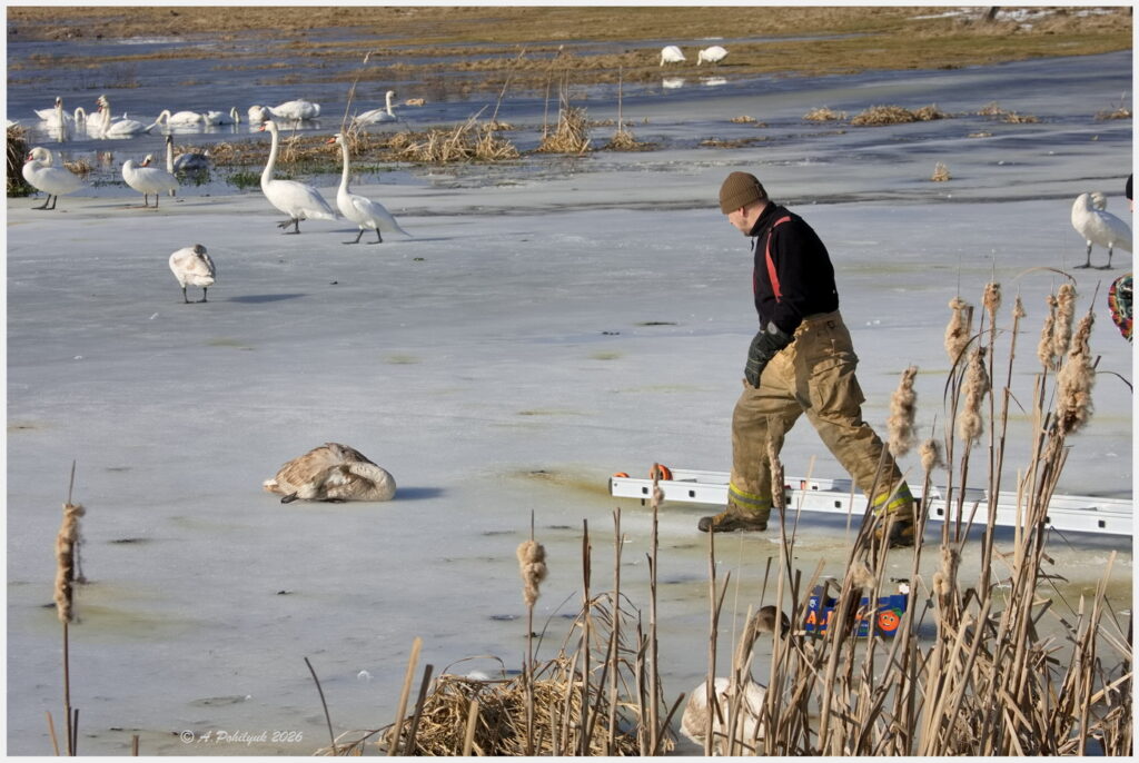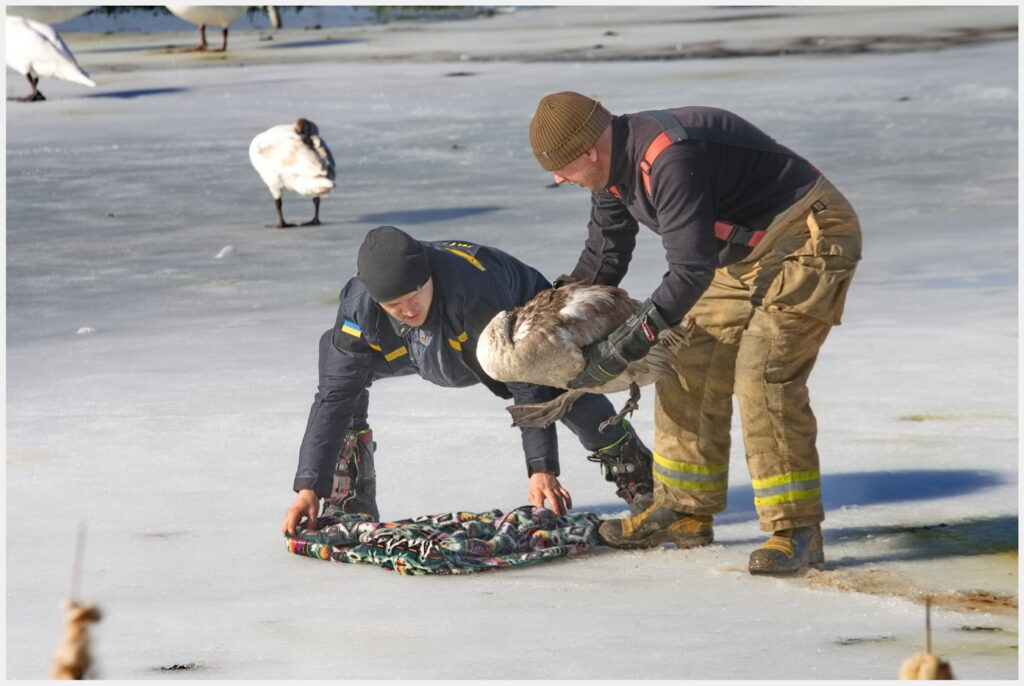 На місце події оперативно прибула Добровольча пожежна команда Шпанівської ТГ. Рятувальники обережно дістали лебедя з криги. Далі до справи долучилися знайомі Ольги — Олександр Шахманціром та Анатолій Похилюк, які саме фотографували птахів на водоймі. Чоловіки без вагань погодилися допомогти і на власному авто транспортували лебедя до зоопарку.