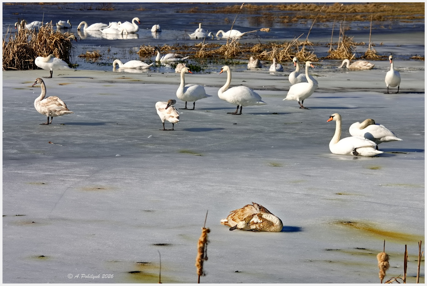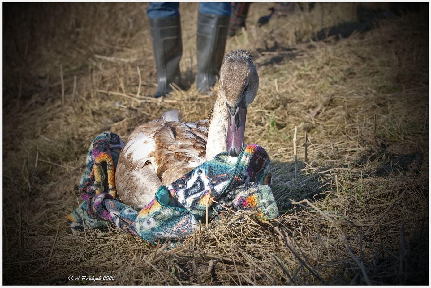Як розповіла рівнянка Ольга Підгорецька, під час прогулянки повз водойму вона помітила дивний сірий згорток серед лебедів на кризі. Підійшовши ближче, жінка побачила, що птах знесилений, намагається рухатись, але крига під ним починає підтавати.