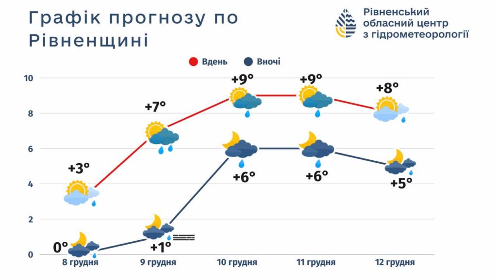 11 грудня, четвер: хмарно. Місцями невеликий дощ. Вночі та вранці місцями туман. Вітер західний, 7-12 м/с. Температура вночі 2-7° тепла, вдень 4-9° тепла.