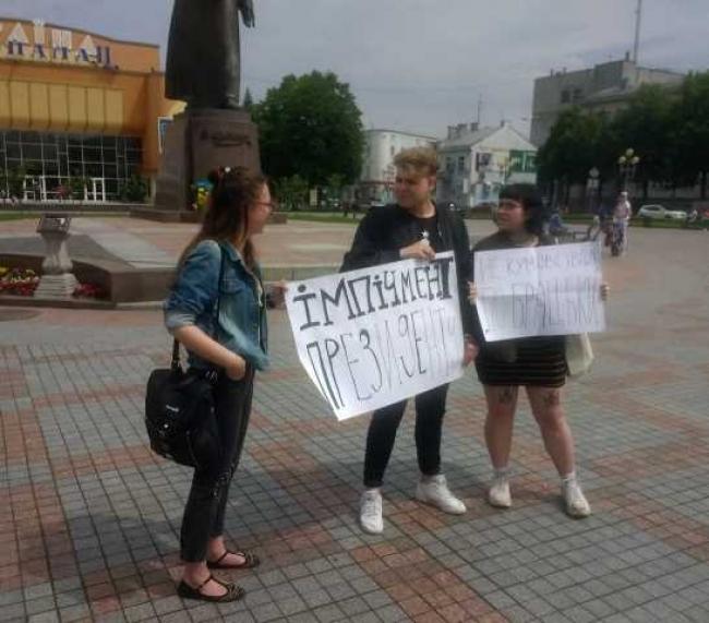 Сьогодні на майдані Незалежності у Рівному 20-ти та 16-річні рівняни стояли з плакатами «Імпічмент Президенту» та «Не кумовство, а по-братськи». Мітинг вони проводили незаконно, оскільки не подали заздалегідь відповідної заявки.