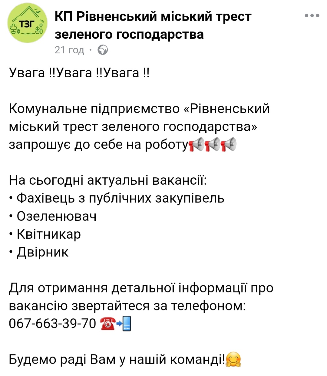 Новини На роботу в ТЗГ у Рівному шукають тих, хто любить і уміє працюватиме з квітами Щоб разом зробити наше місто ще гарнішим. admin 8 Березня, 10:00 0 хв. читання Поділитися Таке оголошення з’явилося на фейсбук-сторінці міського тресту зеленого господарства. Графік відключення електроенергії на Рівненщині 9 грудня Світло вимкнули під час прання… На Рівненщині чоловік роками знущався над тещею — справу розгляне суд Вода після їди розтягує шлунок Біля кінотеатру в центрі Рівного знову роздають гарячі обіди Поділитися цією статтею Facebook Telegram Копіювати посилання Приєднуйтесь 58тисСтежити1.2тисСтежити13.9тисСтежити6.1тисПідписатися Читайте нас у Telegram: тільки важливі та перевірені новини Новини 8 Грудня 2025 Графік відключення електроенергії на Рівненщині 9 грудня 22:04 Світло вимкнули під час прання… 21:35 На Рівненщині чоловік роками знущався над тещею — справу розгляне суд 21:20 Вода після їди розтягує шлунок 21:17 Біля кінотеатру в центрі Рівного знову роздають гарячі обіди 20:45 Вифлеємський вогонь миру привезли до Рівного 20:00 Громада на Рівненщині повідомила про загибель 25-річного військового 19:00 До Миколая діткам загиблих солдатів подарували незабутнє свято 18:59 «Верес» прокоментував зрив матчу у Житомирі 18:15 У лікарні помер кулеметник з Малого Житина 17:30 Всі новини