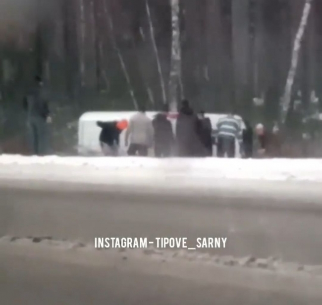 Як повідомляють у спільноті «tipove_sarny», автомобіль перекинувся в кювет. На відео видно, як шестеро чоловіків намагаються перевернути автомобіль.