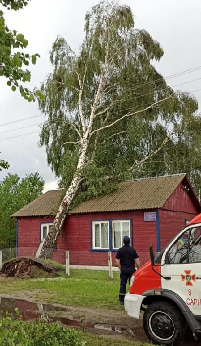 Сьогодні близько 17:00 на спецлінію “101” від громадян надійшло повідомлення, що внаслідок сильних поривів вітру та граду в селі Білятичі Сарненського району на фельдшерсько-акушерський пункт звалилося дерево, а у приміщенні місцевого клубу було пошкоджено 50% даху.